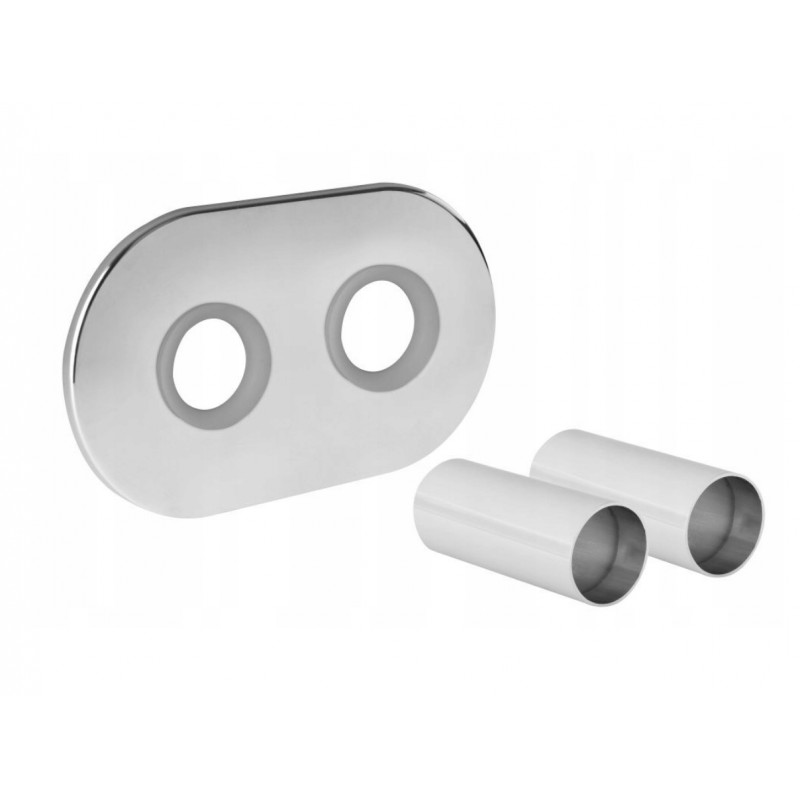 Chromowana rozeta podwójna z tulejami umożliwia sprawną i estetyczną instalację różnych rodzajów instalacji elektrycznych oraz hydraulicznych, takich jak rury, przewody, kabury itp. Zestaw zawiera dwie rozety o średnicy 50 mm oraz 4 tuleje o różnych średnicach (16, 20, 25, 32 mm), co pozwala na łatwe dopasowanie rozmiaru do instalowanej rury lub przewodu.