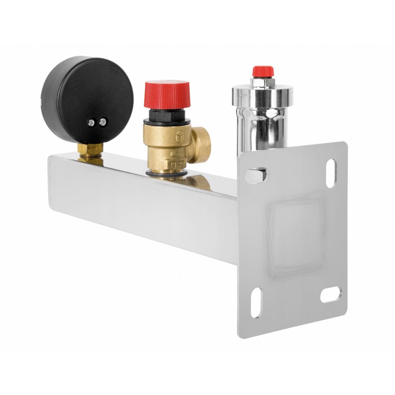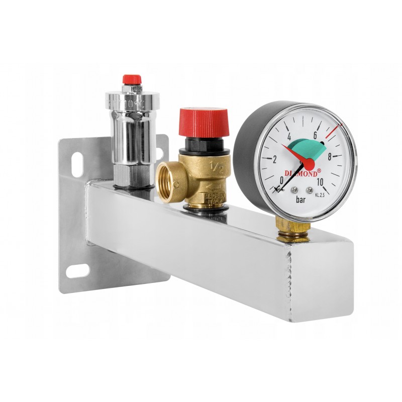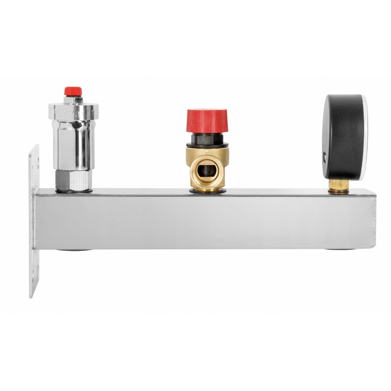 Wysokiej jakości grupy bezpieczeństwa GR.BEZP.CWU do zabezpieczania instalacji ciepłej wody użytkowej przed nadmiernym wzrostem ciśnienia oraz pomiarem ciśnienia. Zbudowana z mosiężnej belki z możliwością podłączenia przeponowego naczynia wzbiorczego. Wyposażone w zawór bezpieczeństwa wykonany z mosiądzu oraz ciśnieniomierz. Grupy bezpieczeństwa charakteryzują się solidnym wykonaniem i trwałym oznaczeniem na korpusach, zgodnie z europejskimi normami.