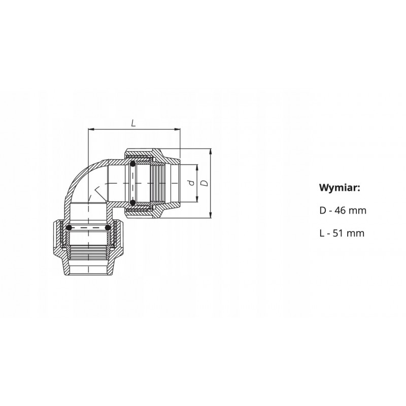 Złączki instalacyjne PE przeznaczone do łączenia rur z polietylenu (PE) w instalacjach wodociągowych wody zimnej. Złączki składaja się z korpusu barwy czarnej, nakrętki barwy niebieskiej, uszczelki typu o-ring oraz pierścieni: dociskowego barwy czarnej oraz zaciskowego barwy białej.