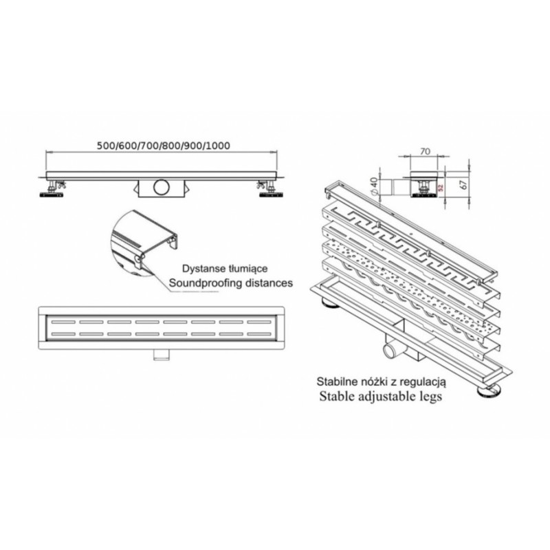 Ten olśniewający odpływ posiada 2 cm kołnierz montażowy, kratki z dystansami tłumiące hałas spadającej wody oraz 40 mm syfon, który można czyścić od góry. Dodatkowo, w zestawie znajdują się nóżki do poziomowania i rura odpływowa o średnicy 40/50 mm, dzięki czemu instalacja jest bardzo prosta. Dlaczego więc czekać? Zafunduj swojej łazience modernizację, na którą zasługuje, dzięki LINEAR DRAIN SLEEK 50.