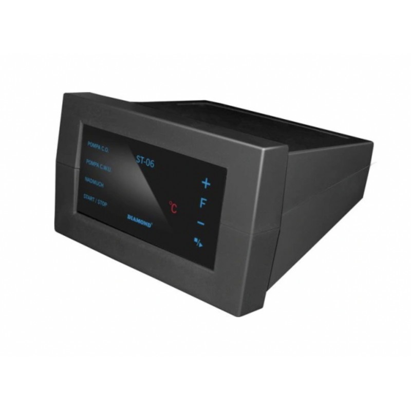 Sterownik ST-06 steruje pompą C.O. oraz C.W.U i wentylatorem nadmuchowym. Posiada panel dotykowy zmożliwością podpięcia termostatu pokojowego. Przeznaczony jest do sterowania kotłami na paliwo stałe. drewno,węgiel, miał. Użytkownik ma do wyboru 5 wersji trybów pracy sterownika uwarunkowanych rodzajem opału oraztypem kotła. Pierwszą czynnością jaką musi wykonać użytkownik przed rozpoczęciem eksploatacji sterownika jestustawienie temperatury pieca, jaką ma utrzymywać sterownik podczas pracy kotła oraz wybrać tryb pracy sterownikaw menu (F). Aktualną temperaturę zasobnika C.W.U. możemy zobaczyć dotykając przycisk [-]. Po 3 sek. sterownikautomatycznie przejdzie w wyświetlanie aktualnej temperatury pieca.