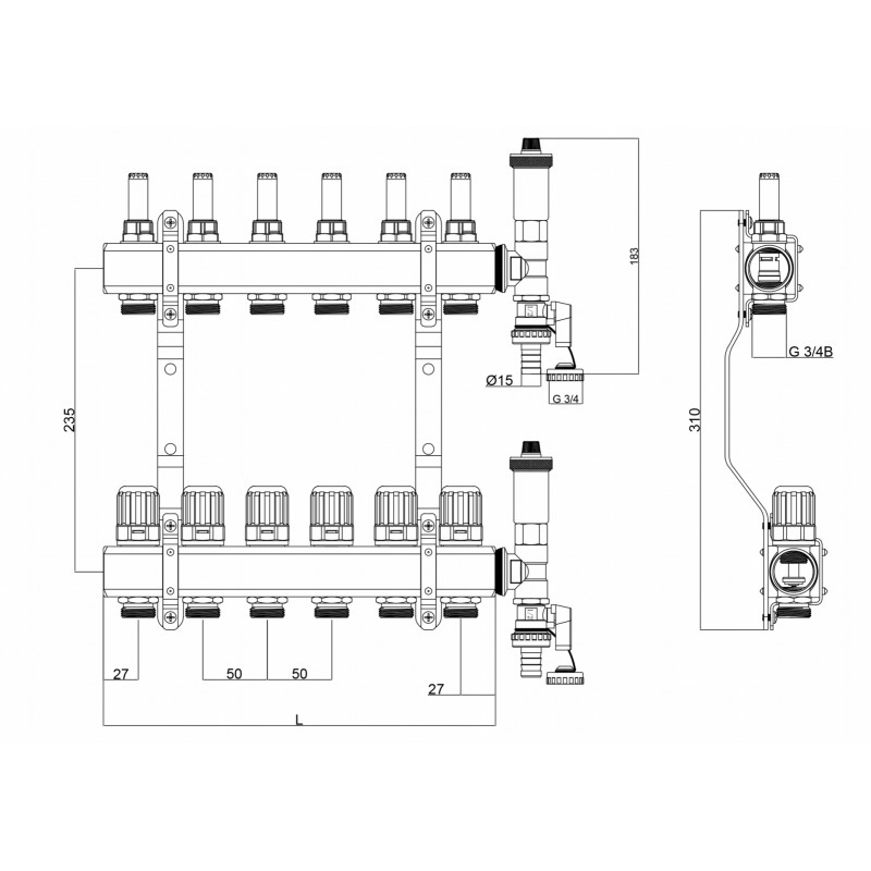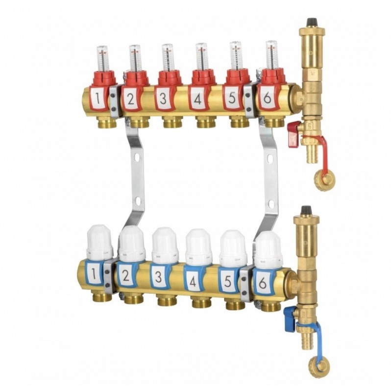 Komplet rozdzielacza z mosiądzu do ogrzewania podłogowego w budynkach. Wyposażone w : łączniki instalacyjne, zawór odpowietrzający C.O. DN15-P, kurek kulowy spustowy C.O. DN-15P, zawór termostatyczny bez głowicy DN15-K, wskaźnik przepływu 0,5 -5l/min. , uchwyt montażowy.
