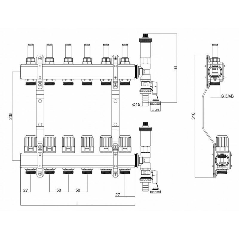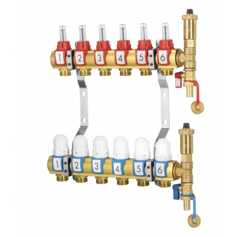 Komplet rozdzielacza z mosiądzu do ogrzewania podłogowego w budynkach. Wyposażone w : łączniki instalacyjne, zawór odpowietrzający C.O. DN15-P, kurek kulowy spustowy C.O. DN-15P, zawór termostatyczny bez głowicy DN15-K, wskaźnik przepływu 0,5 -5l/min. , uchwyt montażowy.