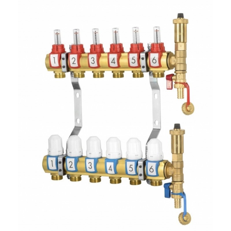 Komplet rozdzielacza z mosiądzu do ogrzewania podłogowego w budynkach. Wyposażone w : łączniki instalacyjne, zawór odpowietrzający C.O. DN15-P, kurek kulowy spustowy C.O. DN-15P, zawór termostatyczny bez głowicy DN15-K, wskaźnik przepływu 0,5 -5l/min. , uchwyt montażowy.