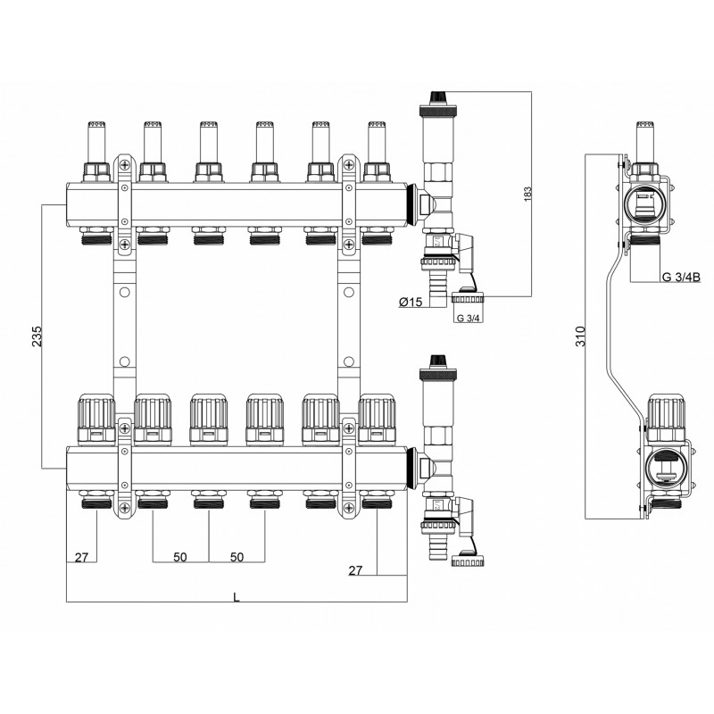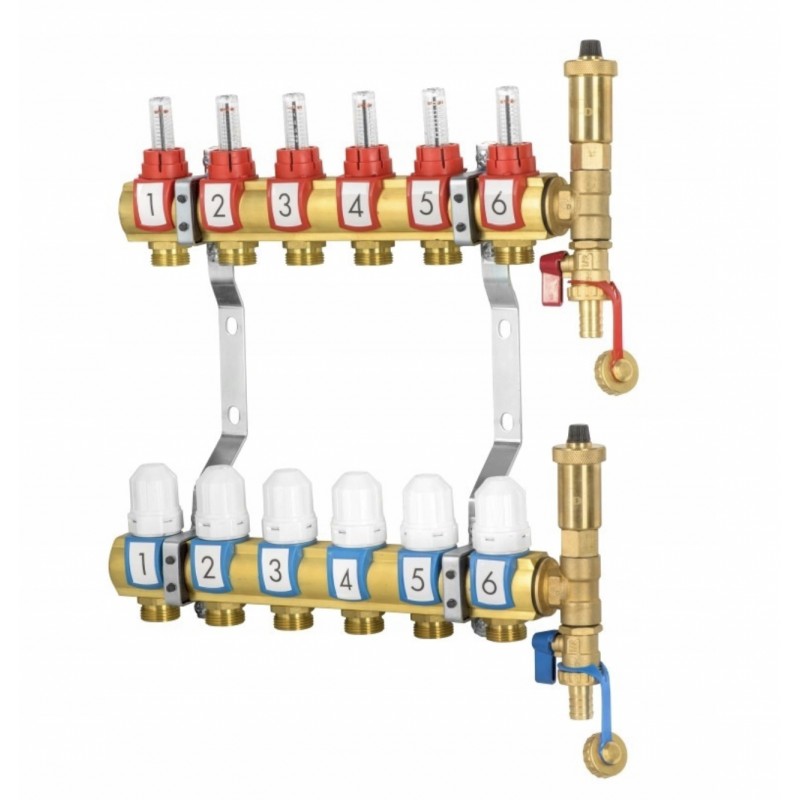 Komplet rozdzielacza z mosiądzu do ogrzewania podłogowego w budynkach. Wyposażone w : łączniki instalacyjne, zawór odpowietrzający C.O. DN15-P, kurek kulowy spustowy C.O. DN-15P, zawór termostatyczny bez głowicy DN15-K, wskaźnik przepływu 0,5 -5l/min. , uchwyt montażowy.