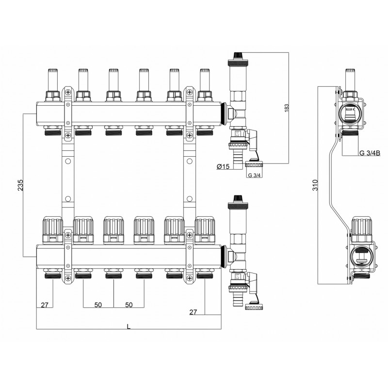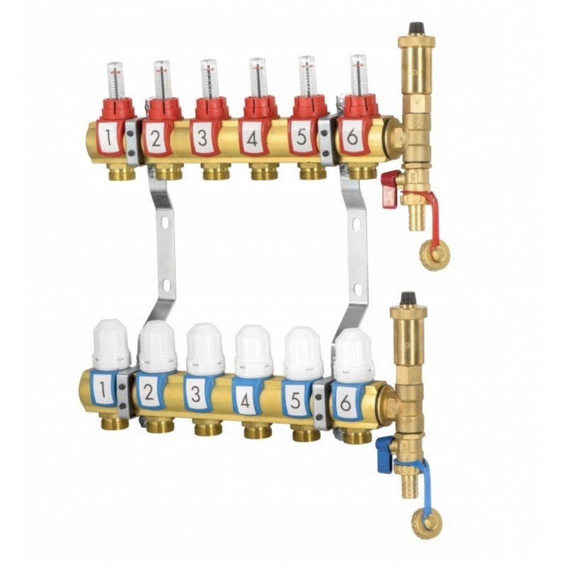 Komplet rozdzielacza z mosiądzu do ogrzewania podłogowego w budynkach. Wyposażone w : łączniki instalacyjne, zawór odpowietrzający C.O. DN15-P, kurek kulowy spustowy C.O. DN-15P, zawór termostatyczny bez głowicy DN15-K, wskaźnik przepływu 0,5 -5l/min. , uchwyt montażowy.