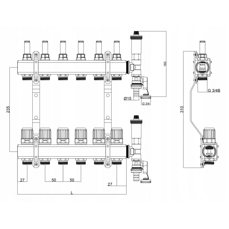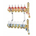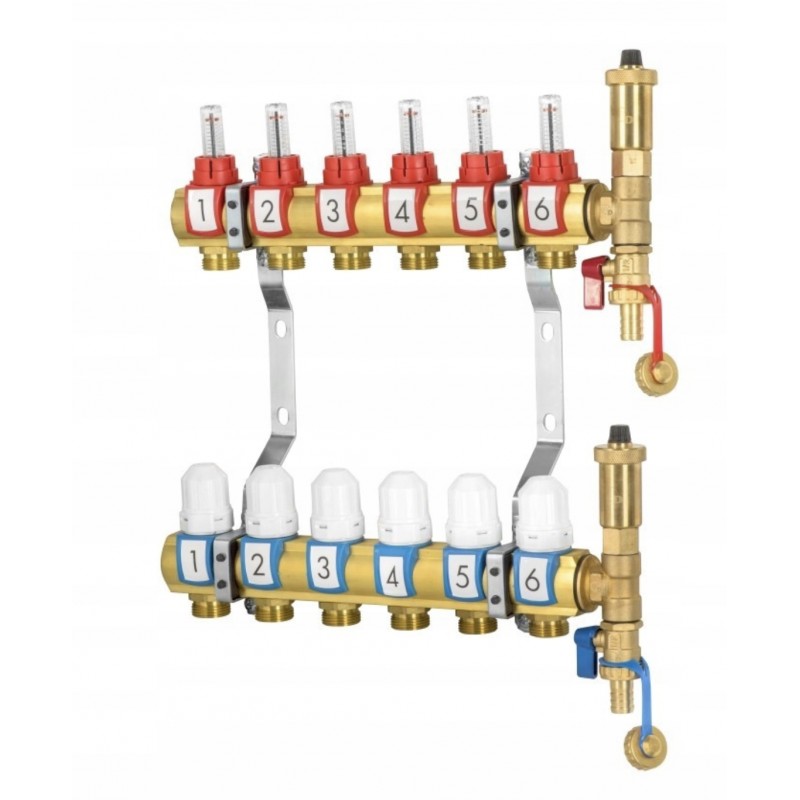 Komplet rozdzielacza z mosiądzu do ogrzewania podłogowego w budynkach. Wyposażone w : łączniki instalacyjne, zawór odpowietrzający C.O. DN15-P, kurek kulowy spustowy C.O. DN-15P, zawór termostatyczny bez głowicy DN15-K, wskaźnik przepływu 0,5 -5l/min. , uchwyt montażowy.