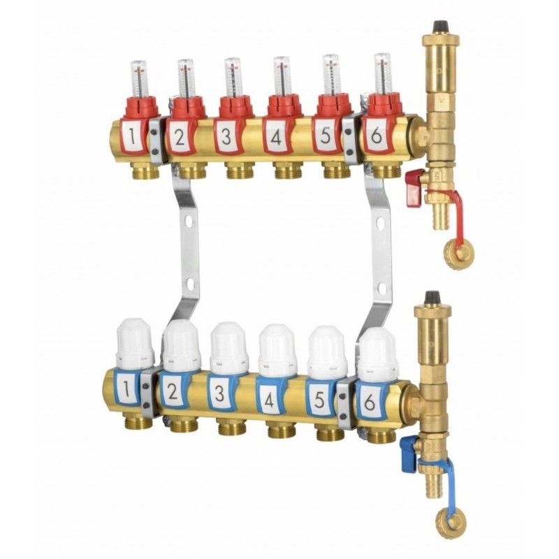 Komplet rozdzielacza z mosiądzu do ogrzewania podłogowego w budynkach. Wyposażone w : łączniki instalacyjne, zawór odpowietrzający C.O. DN15-P, kurek kulowy spustowy C.O. DN-15P, zawór termostatyczny bez głowicy DN15-K, wskaźnik przepływu 0,5 -5l/min. , uchwyt montażowy.