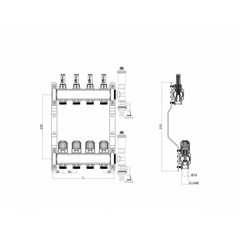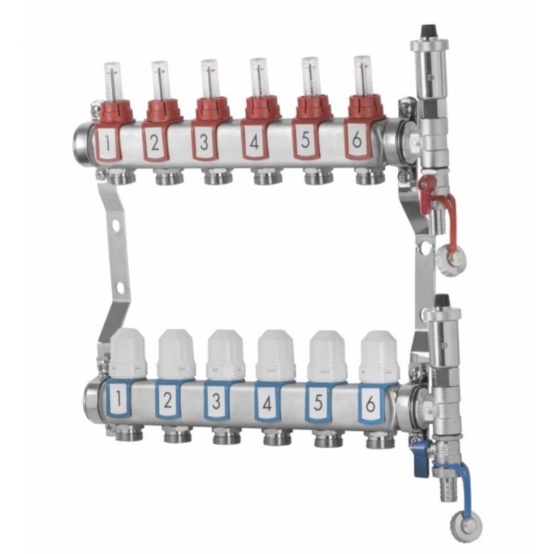 Komplet rozdzielacza z stali nierdzewnej do ogrzewania podłogowego w budynkach. Wyposażone w: łączniki instalacyjne, zawory odpowietrzające C.O. DN15-P, kurki kulowe spustowe C.O. DN-15P, zawory termostatyczne bez głowicy DN15-K, wskaźniki przepływu 0,5 -5l/min., uchwyty montażowe.