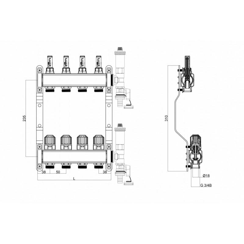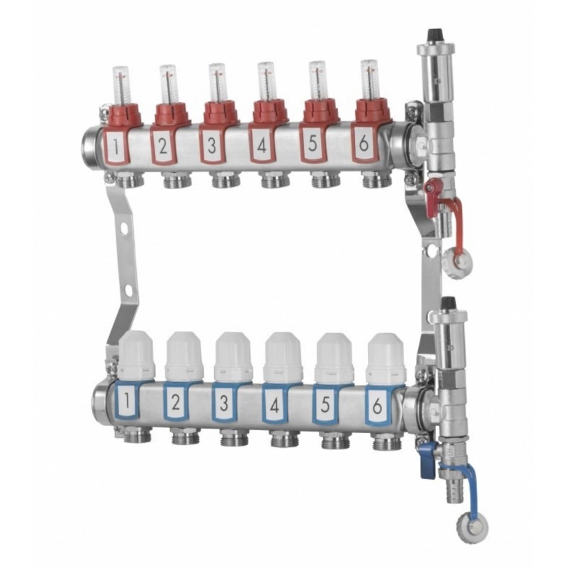 Komplet rozdzielacza z stali nierdzewnej do ogrzewania podłogowego w budynkach. Wyposażone w: łączniki instalacyjne, zawory odpowietrzające C.O. DN15-P, kurki kulowe spustowe C.O. DN-15P, zawory termostatyczne bez głowicy DN15-K, wskaźniki przepływu 0,5 -5l/min., uchwyty montażowe.