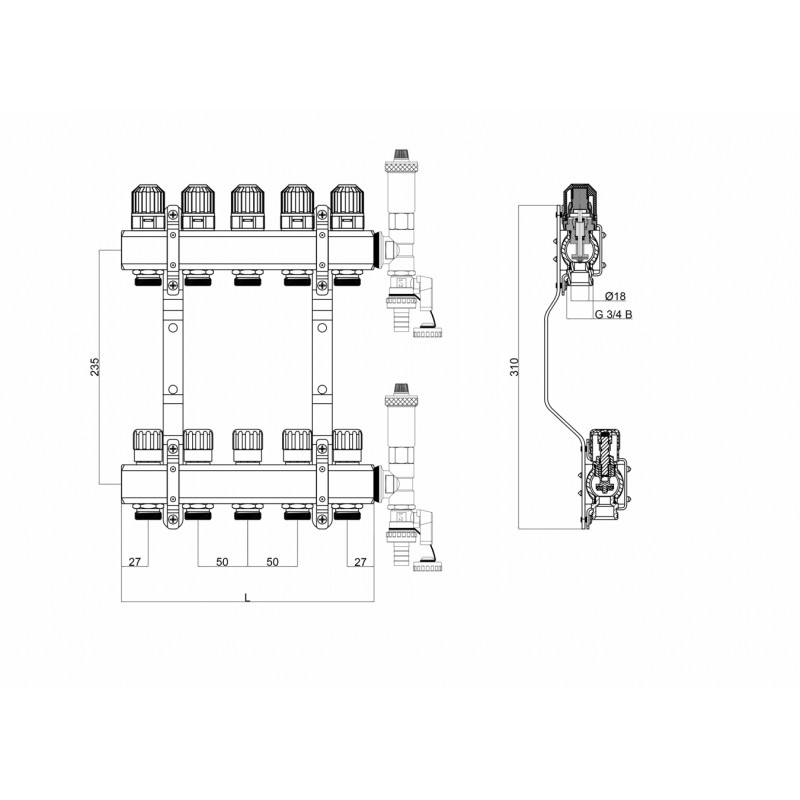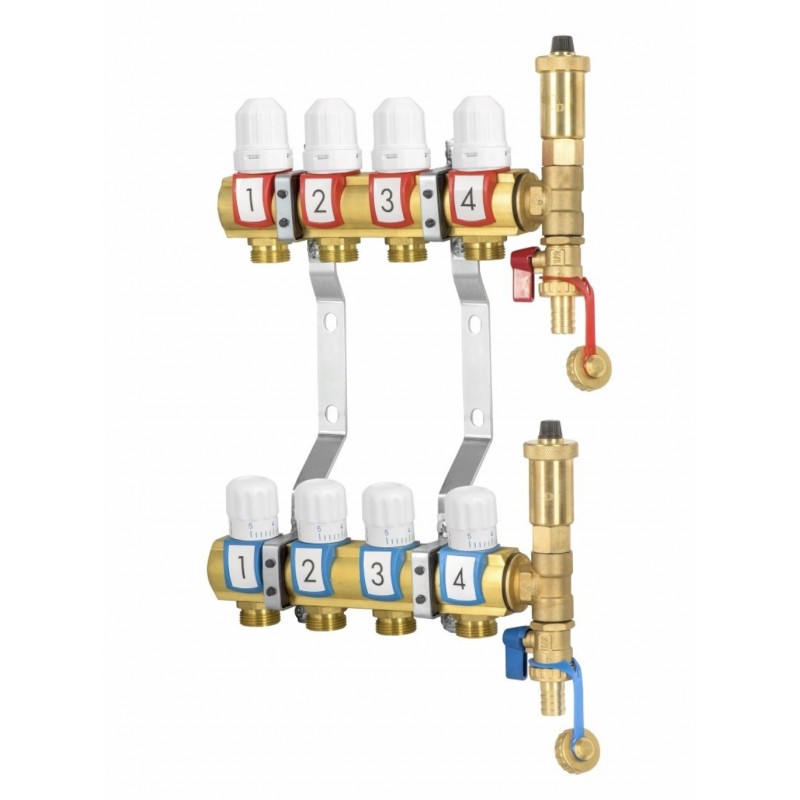 Komplet rozdzielacza z mosiądzu z zaworami regulacyjnymi i termostatycznymi z przeznaczeniem do instalacji centralnego ogrzewania w budynkach, wyposażone w: łączniki instalacyjne mosiężne DN 25, zawory odpowietrzające C.O. DN15-P, kurki kulowe spustowe C.O. DN-15P, zawory termostatyczne bez głowicy DN15-K, zawory regulacyjne C.O. DN 15-K i uchwyty montażowe.