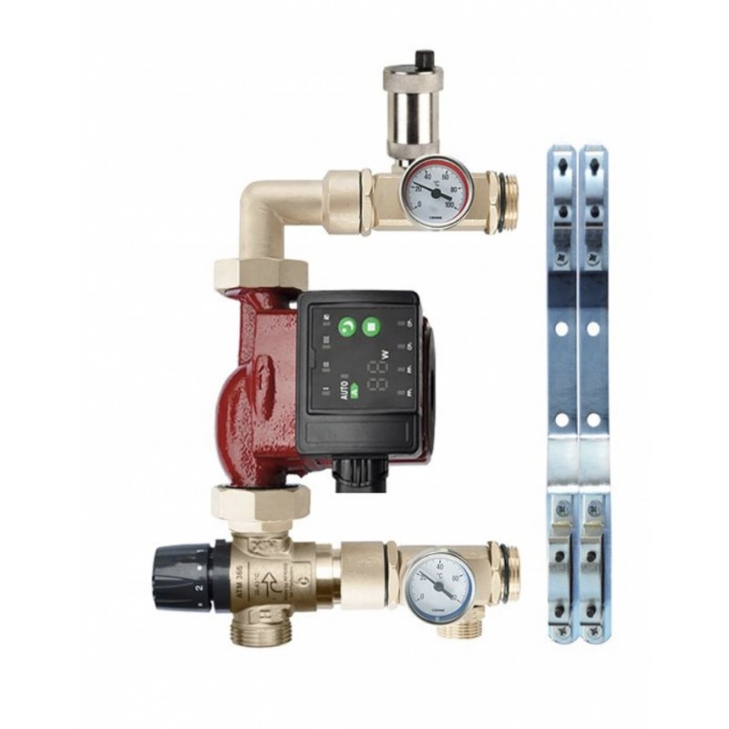 Zestaw wyrobów budowlanych – Grupa mieszająca do ogrzewania podłogowego, wyposażona w : łączniki instalacyjne, zawór odpowietrzający, zawór termostatyczny, termometr i uchwyt montażowy oraz pompę cyrkulacyjną