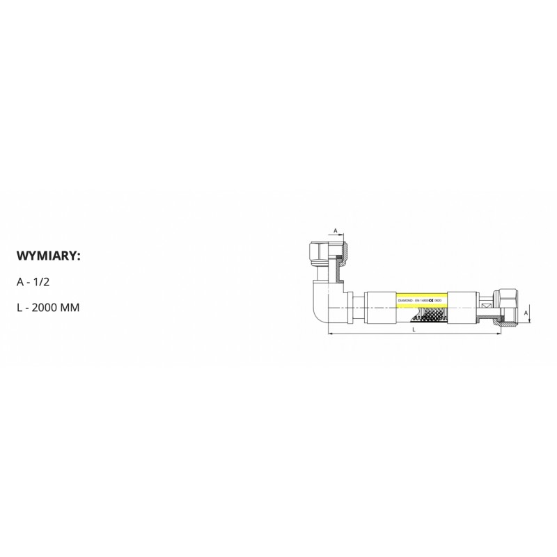 Przewód przyłączeniowy DIAMOND Flex DN 12, którego główne części tj. elastyczna karbowana rura z przyspawanymi przyłączami oraz oplot siatkowy rury wykonane są ze stali nierdzewnej. Od strony zewnętrznej przewód posiada osłonę z PVC. Przyłącze z zawalcowaną, luźną, mosiężną nakrętką posiada uszczelkę z NBR i w wersji kątowej – mosiężne kolano. Przeznaczony jest do przyłączania urządzeń domowych, do instalacji gazowej w budynkach zasilanej gazem naturalnym o ciśnieniu do 0,5 bara.