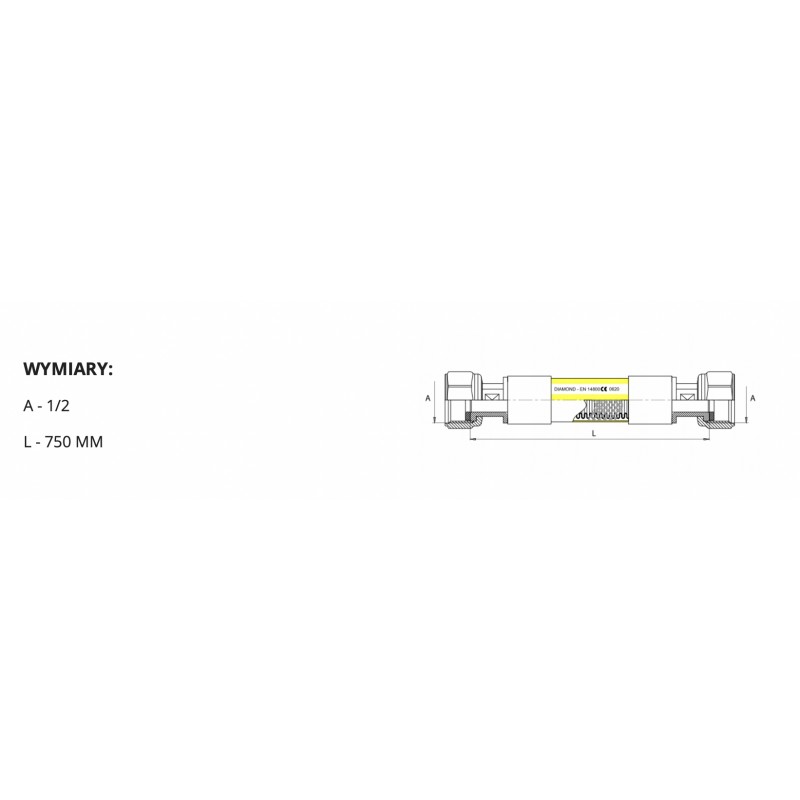 Przewód przyłączeniowy DIAMOND Flex DN 12, którego główne części tj. elastyczna karbowana rura z przyspawanymi przyłączami oraz oplot siatkowy rury wykonane są ze stali nierdzewnej. Od strony zewnętrznej przewód posiada osłonę z PVC. Przyłącze z zawalcowaną, luźną, mosiężną nakrętką posiada uszczelkę z NBR i w wersji kątowej – mosiężne kolano. Przeznaczony jest do przyłączania urządzeń domowych, do instalacji gazowej w budynkach zasilanej gazem naturalnym o ciśnieniu do 0,5 bara.