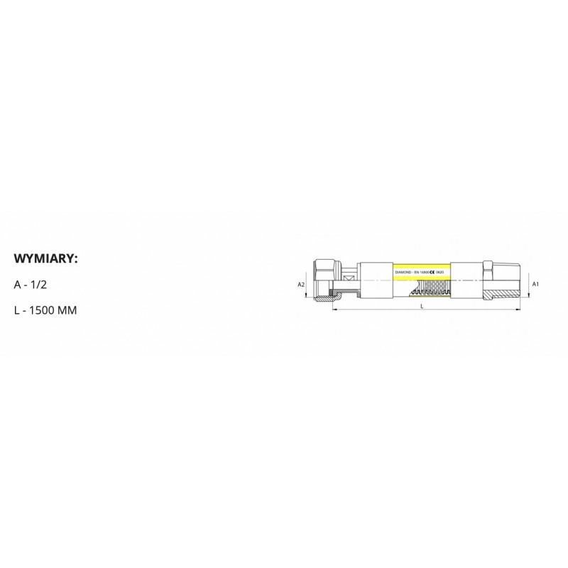 Przewód przyłączeniowy DIAMOND Flex DN 12, którego główne części tj. elastyczna karbowana rura z przyspawanymi przyłączami oraz oplot siatkowy rury wykonane są ze stali nierdzewnej. Od strony zewnętrznej przewód posiada osłonę z PVC. Przyłącze z zawalcowaną, luźną, mosiężną nakrętką posiada uszczelkę z NBR i w wersji kątowej – mosiężne kolano. Przeznaczony jest do przyłączania urządzeń domowych, do instalacji gazowej w budynkach zasilanej gazem naturalnym o ciśnieniu do 0,5 bara.