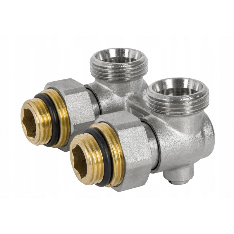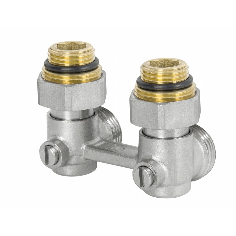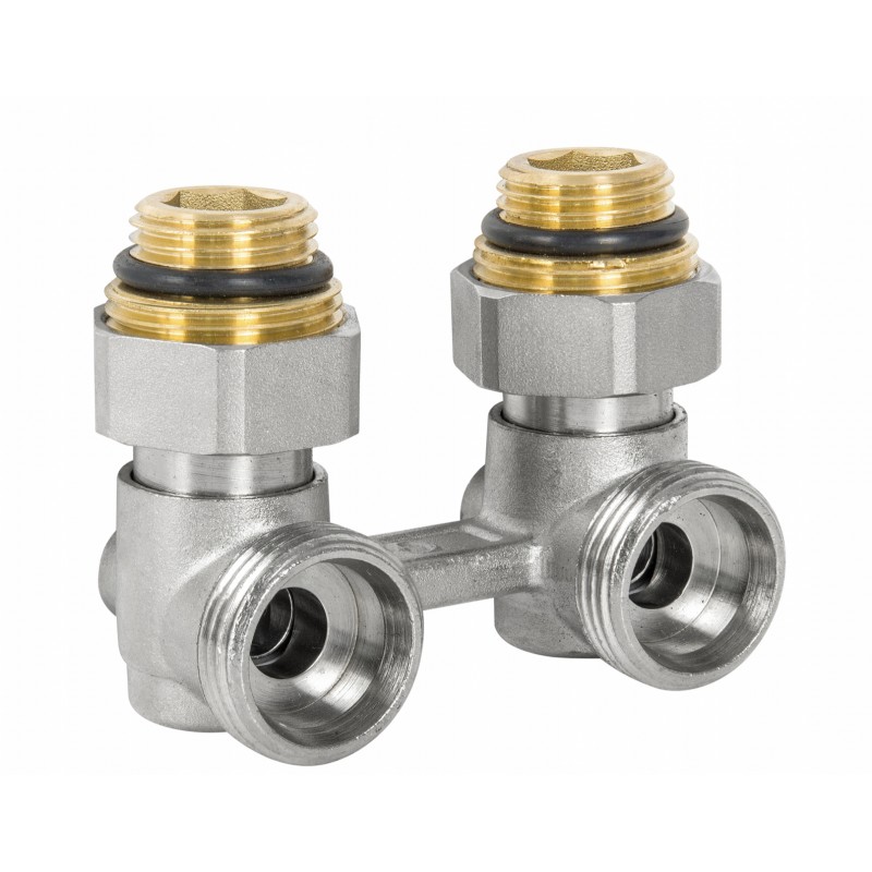 Wysokiej jakości zespół przyłączeniowy z zaworami grzejnikowymi do podłączenia urządzenia grzewczego do instalacji. Zespoły przyłączeniowe występują w wersji prostej jak i kątowej. Do podłączenia grzejnika zasilanego od dołu z wbudowanym zaworem termostatycznym. Wykonane z mosiądzu. Wszystkie zespoły przyłączeniowe są piaskowane i po tej operacji niklowane. Zespoły przyłączeniowe charakteryzują się solidnym wykonaniem i trwałym oznaczeniem na korpusach, zgodnie z europejskimi normami.
