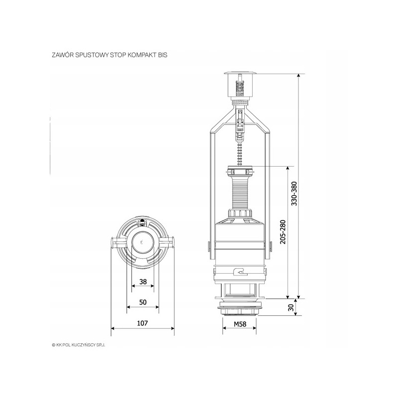 ZAWÓR SPUSTOWY z funkcją STOP KOMPAKT BIS. Przeznaczony do kompaktów o wysokości od 330 do 380 mm i minimalnym poziomie napełnienia 130 mm. Duży zakres nastawiania wysokości. Zawór spustowy KKPOL dostępny w wersjach z dwoma rodzajami przycisków